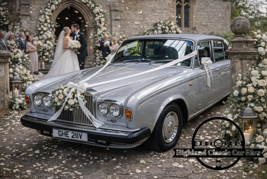 Finished in a stunning silver with gleaming chrome accents, this iconic wedding car offers a graceful presence that photographs beautifully against any venue backdrop. The long, sweeping body lines and the legendary Spirit of Ecstasy bonnet ornament create an unforgettable first impression, ensuring your arrival is nothing short of spectacular.